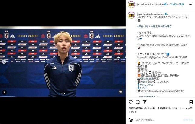 日本代表・古賀塔子(なでしこジャパンインスタグラムより)