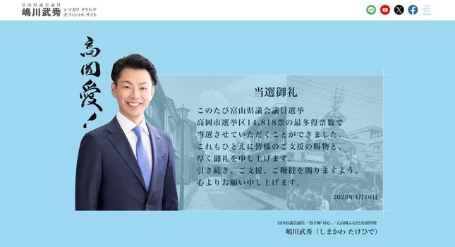 実は、嶋川さんは、現役の富山県議会議員だ。公式サイトによると、芸人として福島県を拠点に活動したのち、19年3月から21年3月に地元・富山県高岡市の「高岡ふるさと応援特使」に就任。21年10月に高岡市議会議員選挙に出馬、トップ当選を果たす。23年4月に富山県議会議員に県内最多得票で初当選した。議員として活動しながら、母心としてはナイツ・塙宣之さんが会長を務める漫才協会に所属。二足の草鞋を履く芸人だ。