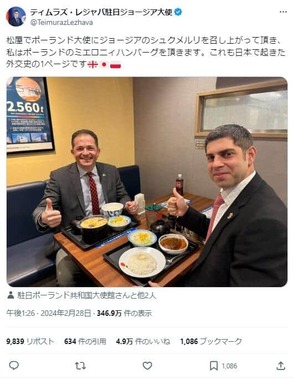 レジャバ大使は28日、料理を前に笑顔でポーズを決めた2人の写真を添え「松屋でポーランド大使にジョージアのシュクメルリを召し上がって頂き、私はポーランドのミエロニィハンバーグを頂きます。これも日本で起きた外交史の1ページです」と投稿した。