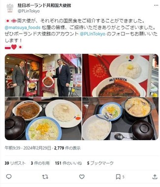 駐日ポーランド大使館も、写真つきで「両大使が、それぞれの国民食をご紹介することができました。 松屋の皆様、ご招待いただきありがとうございました」と書き込んだ。