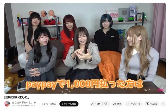 2024年2月27日、YouTubeチャンネル登録者数63万人超の6人組女性アイドルグループ「おこさまぷれ~と。」メンバーの「ごりか」さんが詐欺にあったことをYouTubeで告白した。
