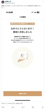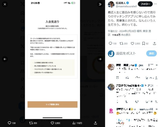 松浦氏は28日にXで、「最近人生に面白みを感じないので流行りのマッチングアプリに申し込んでみたら、見事落とされた」と報告。「厳正なる審査の結果、入会を見送らせていただくことになりました」と記されたスクリーンショットも公開した。この結果に松浦氏は「なんという人生だろう。終わってる」と嘆き。