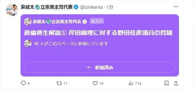 立憲の泉代表は、その様子をXのスペース機能を使って「生解説」。岸田氏が政治資金パーティーを開いていることが「大臣規範」に触れると指摘されている問題では、野田氏の問いかけに対して、岸田氏は在任中は開かないことを明言した。泉氏は、野田氏の質問に「在任中やるのかやらないのか、ここは言うんじゃないですかね~」。岸田氏の答弁を受けて「この場があって、そして質疑があるから、1歩1歩、小さな話だが進んでいくということ」などと、政倫審の意義を説明した。