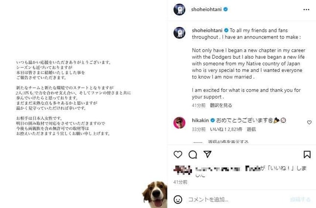 米大リーグのロサンゼルス・ドジャースの大谷翔平選手が2024年2月29日(日本時間)、日本人女性と結婚したことをインスタグラムで発表したことを受け、お笑い芸人・ゆりやんレトリィバァさんが「【緊急会見】」と題したインスタライブを行い、視聴者の笑いを誘っている。