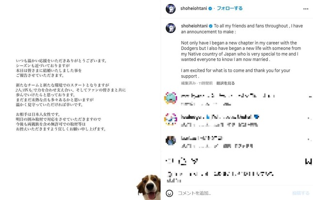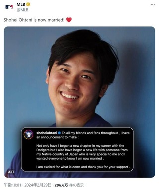 MLB公式Xも大谷選手が結婚したことをポストしている。