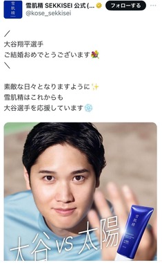 寝具メーカーの西川はXに「大谷翔平選手ご結婚おめでとうございます。これからもnishikawaは大谷選手を睡眠でサポートします」、コーセーの「雪肌精」公式Xは「大谷翔平選手ご結婚おめでとうございます。素敵な日々となりますように雪肌精はこれからも大谷選手を応援しています」と投稿。