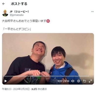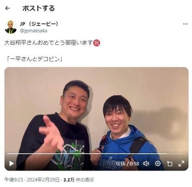 お笑い芸人のJPさんが2024年2月29日にXで、同日(日本時間)に結婚発表した米大リーグのロサンゼルス・ドジャースの大谷翔平選手を祝し、意外な題材のモノマネ動画を投稿した。
