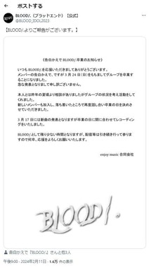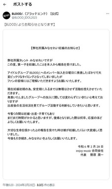 女性アイドルグループ「BLOOD/.(ブラッドエンド)」に加入発表されたばかりのメンバー・みなせれいさんが2024年2月28日、妊娠が発覚したため活動休止するとXで発表し、注目を集めている。