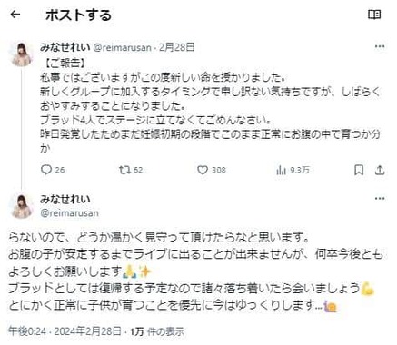 みなせさんは2月28日にXで、「【ご報告】私事ではございますがこの度新しい命を授かりました」と公表した。今後グループに復帰する予定としつつ、下記のように伝えている。