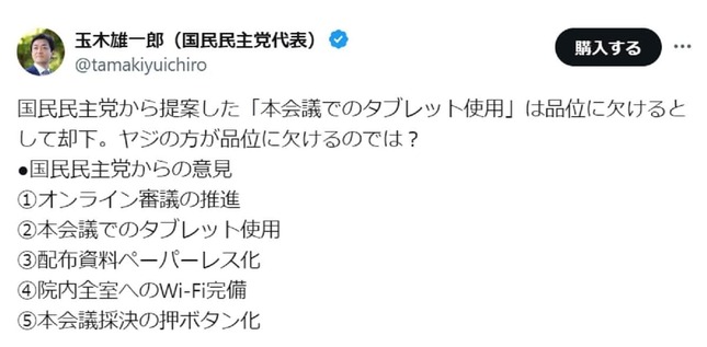 タブレット使用は品位に欠けるとの見方については、批判が次々に寄せられた。「自分たちを貴族か特権階級とでも思っているのか」「『品位』を理由に否定するなど、時代錯誤も甚だしい」といったものだ。国民民主党の玉木雄一郎代表は、本会議でのタブレット使用は同党から提案したとX上で説明し、「品位に欠けるとして却下。ヤジの方が品位に欠けるのでは?」と疑問を呈した。