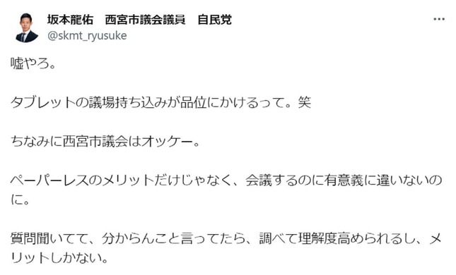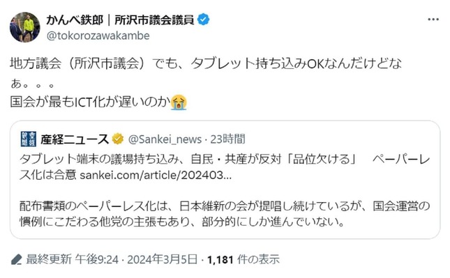 地方議会の一部では、タブレット使用が進んでおり、各議員からもX上で異論が出た。「調べて理解度高められるし、メリットしかない」(自民党の坂本龍佑西宮市議)「国会が最もICT化が遅いのか」(日本維新の会の神戸鉄郎所沢市議)といった意見が与野党双方から書き込まれている。