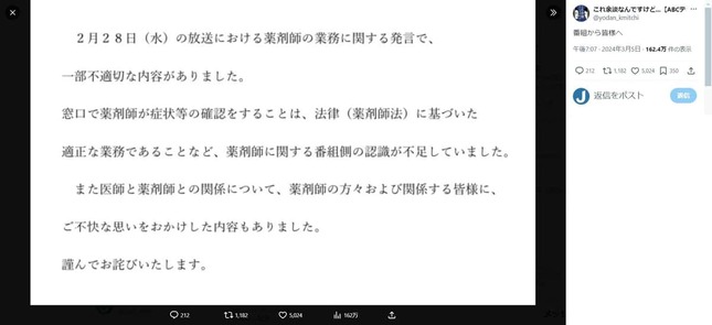 これにSNSで、薬剤師による症状等の確認作業の重要性についての指摘や、薬剤師を軽視しているとの批判が寄せられると、濱家さんは3月1日、Xで「処方箋の件、考えなしに失礼な事言ってしまいました」として謝罪。番組公式Xも5日に謝罪した。