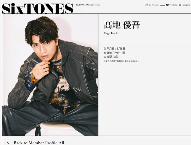 アイドルグループ「SixTONES」の高地優吾さんの年齢が「本人の希望」で非公開になり「初めて見る光景」「面白過ぎる」などとXで話題になっている。高地さんの生まれ年は、2024年3月8日までに公式サイトなどから削除されている。