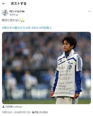 シャルケの日本語版Xは24年3月11日に、「絶対に忘れない(合掌の絵文字)」「#東日本大震災から13年 #S04 #内田篤人」と投稿。前出のユニフォームを着た当時の内田氏の写真も公開した。