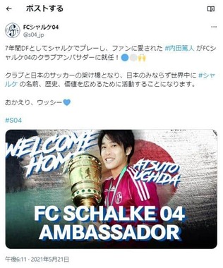 内田氏は10~17年にシャルケに所属しており、東日本大震災翌日の11年3月12日には、試合後に「日本の皆へ 少しでも多くの命が救われますように 共に生きよう!」と直筆で書いたユニフォームを着て観客の前に立ち、大きな話題を呼んでいた。21年からはクラブアンバサダーも務める。