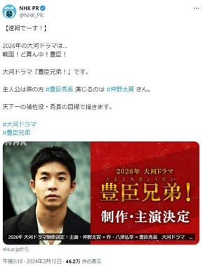 NHKは2024年3月12日、2026年の大河ドラマが『豊臣兄弟!』に決まったことを発表した。主演は仲野太賀さん。豊臣秀吉の弟、豊臣秀長を演じる。放送は2026年1月から。