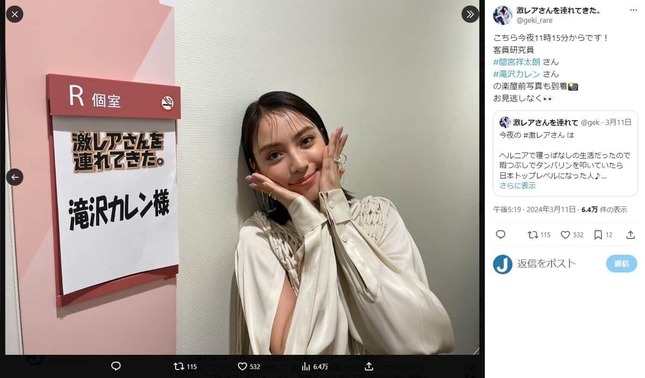 滝沢さんが出演したのは、同日に放送された「激レアさんを連れてきた。」の未公開トーク動画だ。同番組では「最近あった激レア体験」をゲストに聞くのが恒例となっており、トークを振られた滝沢さんは「ちょうど去年の冬に出来事があって...」と切り出した。