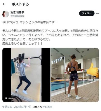投稿にはXユーザーから、「この2行に凡人にはわからない努力や苦しみがあるんだろうな 生きていてこんなにも輝く努力をされていて頭上がりません」「諦めたくなった時に池江選手を思い出します 物凄く4年と言う時の重さを感じました」「TLに流れてきたけど、この2行だけで泣きそうになった」といった声が寄せられている。