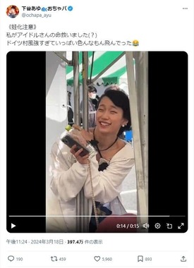 下谷さんは翌18日、Xで「蛙化注意」と切り出し、「私がアイドルさんの命救いました(?)ドイツ村風強すぎていっぱい色んなもん飛んでった」と報告。強風の中、下谷さんがテントのポールにしがみつき、飛んでいくのを阻止している動画を公開した。動画ではポールが地面から浮いているように見え、下谷さんは風で髪を乱しながら、必死にテントを押さえている様子だった。