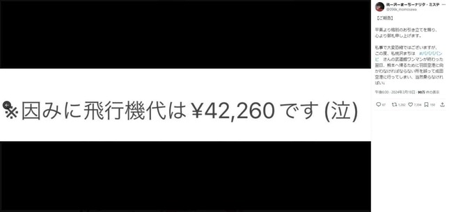 飛行機代が4万2260円かかったことも明かし、「スタッフさんの善意で1いいねにつき1円支給して下さるそうです。何卒ご協力の程よろしくお願いいたします」と呼びかけた。19日夕時点で、投稿には8000超のいいねが付いている。