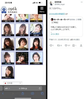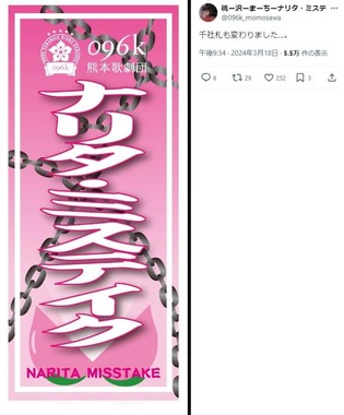 熊本を拠点に活動する女性歌劇団「096k(オクロック)熊本歌劇団」の桃沢まちさんが2024年3月18日にXを更新し、改名を発表した。その名前にXユーザーからは驚きの声が上がっている。