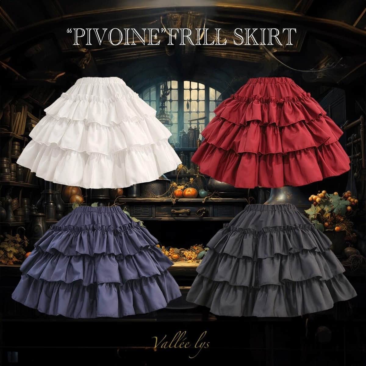 カラーは、ホワイト、ピンク、ボルドー、パープル、ブルー、ブラックの6色。このバッスルスカート(カラー部分)のスカートも、リボンで引っ張り調整できる。スカートはバッスルスカートとシフォンタイプのスカート、さらに裏地のスカート3枚が重なっているデザインだ。