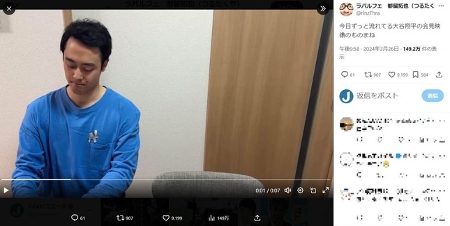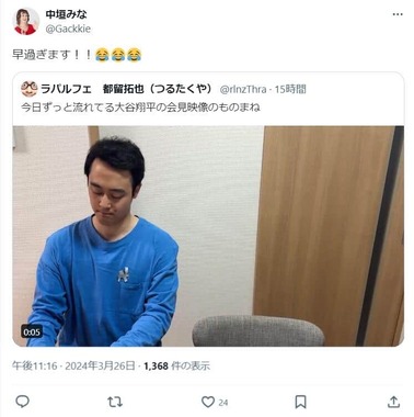都留さんはXで、「今日ずっと流れてる大谷翔平の会見映像のものまね」として、7秒の動画を公開。手作りと思われる「LA」のロゴを付けた青い長袖Tシャツを着た都留さんが、アイアトン氏が26日の会見でメモを取る様子をものまねした。なお、動画内で都留さんは言葉を発していない。