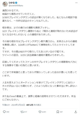 花咲さんの行動について、「3/17の煽りVの撮影も無断ブッチし」と明かし、21日には浦西さんにBreakingDown運営から「相手と連絡が取れないため試合がなくなるかもしれない」と連絡が来たと明かした。その後25日に、運営側から「試合破棄の連絡」があったという。