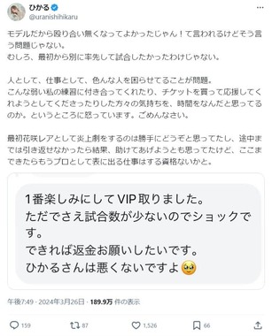 浦西さんは「応援してくださってたファンの方やブレイキングダウンの視聴者をバカにする身勝手で酷い行為だと思います」と非難しつつ、「ここまで非常識だと思っておらず関わってしまった自分が悪いとも思っています」と反省の意も述べた。