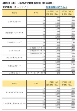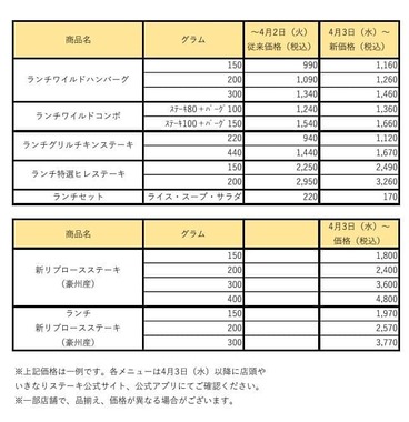 また、「ランチワイルドステーキ」150グラムが1390円→1560円、200グラムが1740円→1960円、300グラムが2290円→2560円、450グラムは2990円→3360円となる。