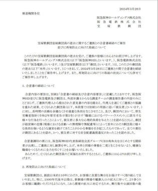 宝塚歌劇団の宙組に所属する女性が2023年9月に急死した問題をめぐり、阪急阪神ホールディングスと阪急電鉄、宝塚歌劇団は遺族と合意書を締結した。24年3月28日、阪急阪神ホールディングス(HD)が公式サイトで発表した。
