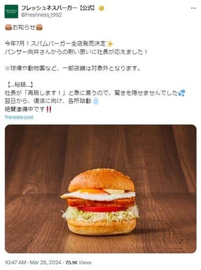 フレッシュネスバーガーは2024年3月28日、公式X「フレッシュネスバーガー【公式】」(@Freshness_1992)で、「スパムバーガー」を発売、復活すると明らかにした。