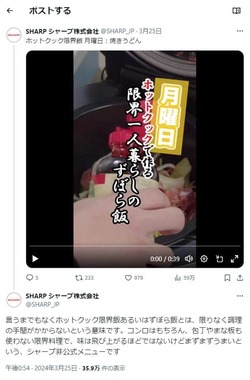 シャープ公式Xは2月20日に「ホットクックをお使いのみなさん。新生活の準備がはじまるこの季節。希望に満ちた後輩に背中を見せる先輩として、限界ひとり暮らしアドバイスを残しませんか。あなたのホットクック、究極のずぼらレシピを教えてください」とし、ホットクックで手間がかからず作れる「限界レシピ」を募集した。3月25~28日にかけて順次、集まったレシピから5品を実際に調理する動画を投稿していた。