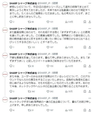 シャープ公式Xが2024年3月28日、電気調理鍋「ホットクック」の広告企画で一般ユーザーから募集したレシピを「まずまずうまい」などと評して批判が寄せられたことを受け、「この言葉は軽率でした」と謝罪した。