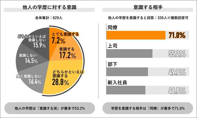 ライボの調査機関「Job総研」が社会人男女629人を対象に実施したアンケートによると、学歴とキャリアの関係について「とても関係すると思う」「関係すると思う」が48.7%と半数近くにのぼった。