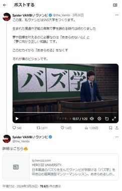 「SNS大学」の発表に際し、ヴァンビさんはXに公開した動画でも「大学」をつくると訴え、「バズ学」と題した「新たな学問」を提供すると説明。バズの本質を追求するものだという。