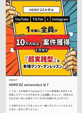 公式サイトは「1年制のオンラインSNS大学」をうたい、「HERO'ZZ UNIVERSITY」「HERO'ZZ大学」を名乗っている。現役のクリエーターを講師に据え、SNSに関して「1年後に全員が『フォロワー10万人以上』『案件獲得』を目指す『超実践型』の本格マンツーマンレッスン」を行うという。料金プランはいずれも1年コースの2種類で、受講料が総額87万7800円(税込)、または65万7800円(税込)。
