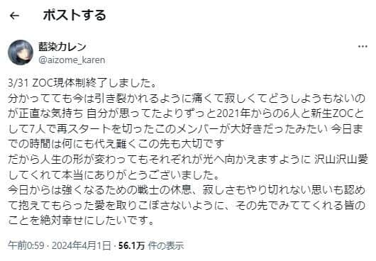 アイドルグループ「ZOC」メンバーの藍染カレンさんが2024年4月1日にXを更新し、グループの現体制終了に際して「正直な気持ち」を伝えた。
