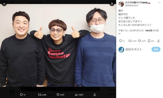 3月31日に最後の放送を迎えられた事に運命を感じます」と投稿。和牛結成のきっかけを作ったという同期のお笑い芸人・バイク川崎バイクさんも「僕が 組ませた ビーフ達でした また会う日ィアまで!たくさんおつかれありがとう!」と労いの言葉を送った。