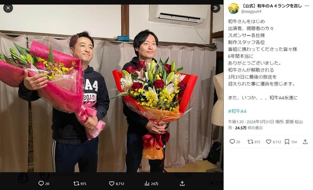 24年3月31日に最終回が放送された冠番組「和牛のA4ランクを召し上がれ!」(南海放送)の公式Xは、「6年間本当にありがとうございました。和牛さんが解散される