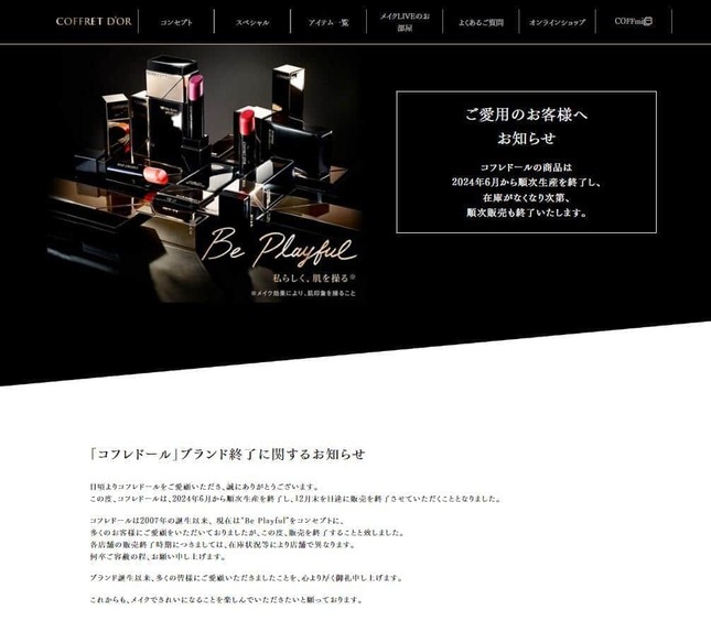 「コフレドールは07年の誕生以来、 現在は『 Be Playful』をコンセプトに、多くのお客様にご愛顧をいただいておりましたが、この度、販売を終了することと致しました」としている。「事業戦略の見直し」が背景にある。6月より順次生産を終了し、12月末をめどに販売を終了する予定だという。