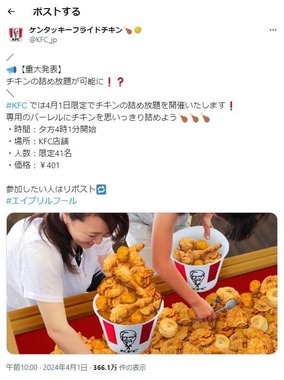 イメージ写真とともに「KFCでは4月1日限定でチキンの詰め放題を開催いたします!専用のバーレルにチキンを思いっきり詰めよう」とうたい、「時間:夕方4時1分開始 場所:KFC店舗 人数:限定41名 価格:¥401」と記された。参加希望者のリポスト(拡散)を募ったうえ、末尾のハッシュタグ「#エイプリルフール」でネタ投稿と知らせている形だ。
