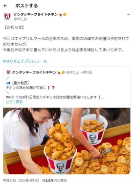 同日、KFC公式Xは、「【お知らせ】今回はエイプリルフールの企画のため、実際の店舗での開催は予定されておりませんが、今後もみなさまに喜んでいただけるような企画を検討してまいります」とも投稿している。