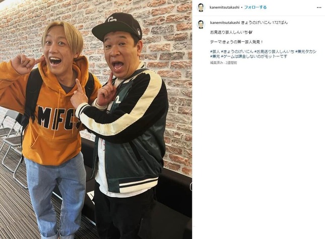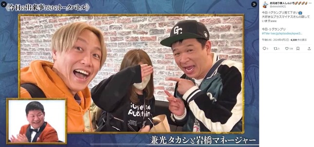 2024年4月1日深夜(2日未明)放送のバラエティー番組「今日-1グランプリ」(テレビ東京系)にピン芸人のお見送り芸人しんいちさんが出演し、元プラス・マイナスの兼光タカシさんとのエピソードを明かした。
