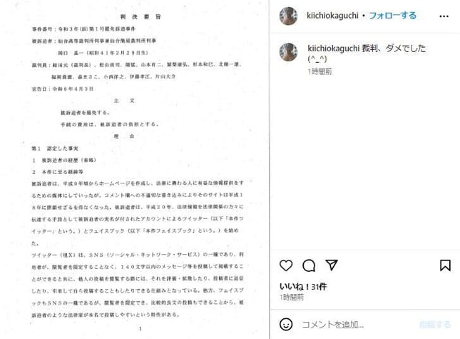 岡口氏は判決後にインスタグラムとフェイスブックを更新。「被訴追者を罷免する」という主文が読みとれる「判決要旨」の写真を「裁判、ダメでした」という絵文字とともに掲載した。笑顔を表す絵文字で、判決前の