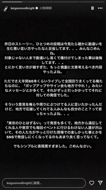 人気ロックバンド「Novelbright」のベーシスト・圭吾さんがインスタグラムのストーリーズに投稿したとされる内容が、Xで波紋を広げた。圭吾さんはストーリーズとXで謝罪と釈明のポストを投稿し、これに音楽ファンらからさまざまな意見が寄せられている。