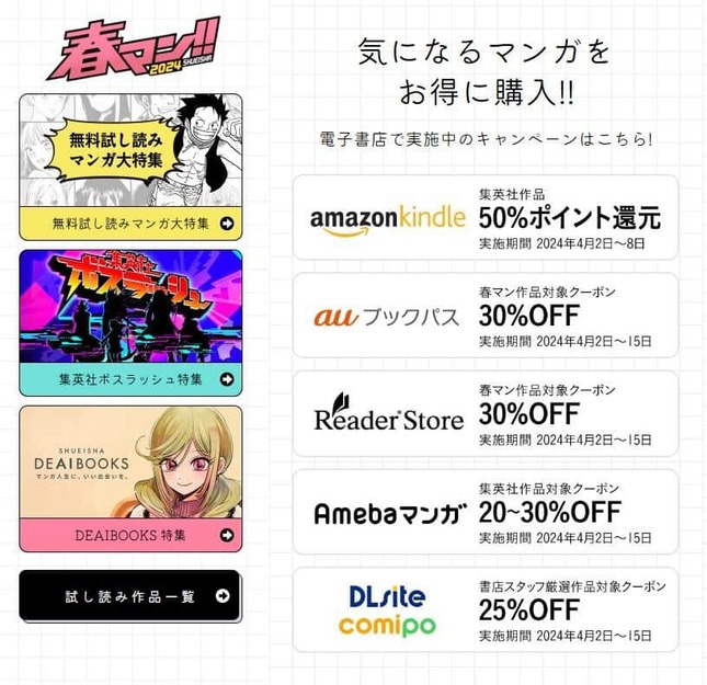 背景には、版元の集英社による漫画の祭典「春マン!!2024」が関係しているとみられる。企画の一環として、Amazonの電子書籍ストア「Kindle」でポイント還元キャンペーンが開催されており、Xには漫画読者の感想などが続々と上がっている。