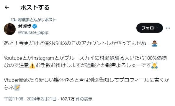 村瀬さんは2月21日にXで「今更だけど僕SNSはXのこのアカウントしかやってませぬー」とし、「YoutubeとかInstagramとかブルースカイに村瀬歩騙る人いたら100%偽物なので注意 お手数お掛けしますが通報とか報告よろしゅーです」と注意喚起していた。