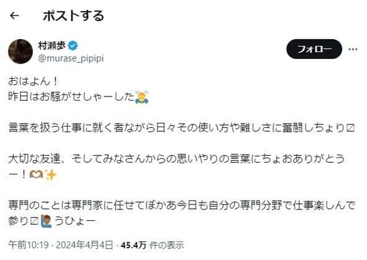 4日には「昨日はお騒がせしゃーした」「専門のことは専門家に任せてぼかあ今日も自分の専門分野で仕事楽しんで参り」と伝えていた。