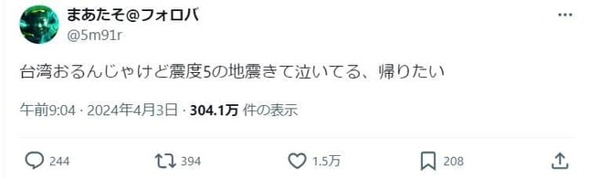 まあたそさんは、Xのサブアカウントに「台湾おるんじゃけど震度5の地震きて泣いてる、帰りたい」と投稿。続けて「余震やばい」などとポストしている。
